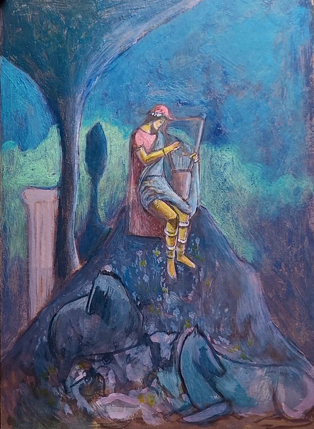 Orpheus calming the animals with his lyre. Preliminary sketch. Mixed media on board.